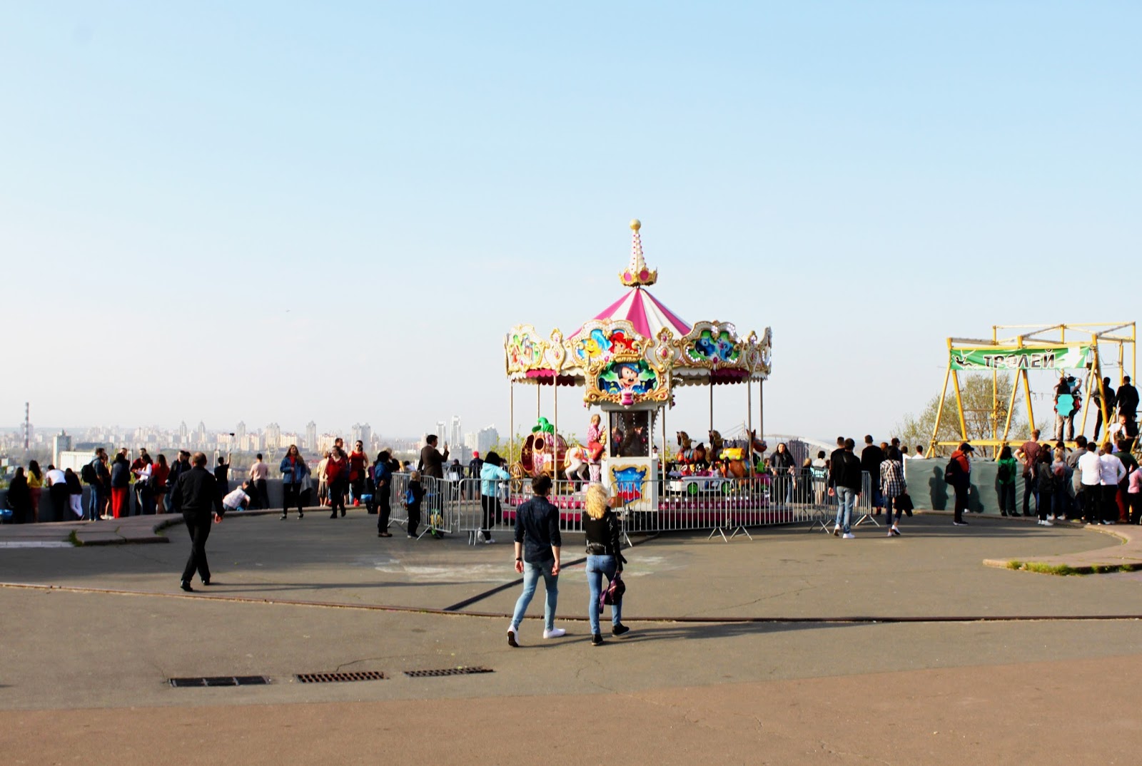 Многолюдно на площадке обозрения под Аркой Дружбы народов. Работает детская карусель, нет отбоя от желающих прокатиться на Троллее над Днепром.